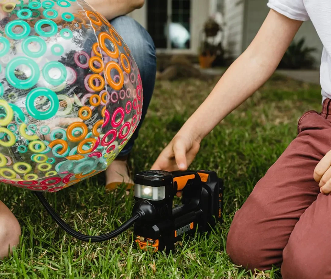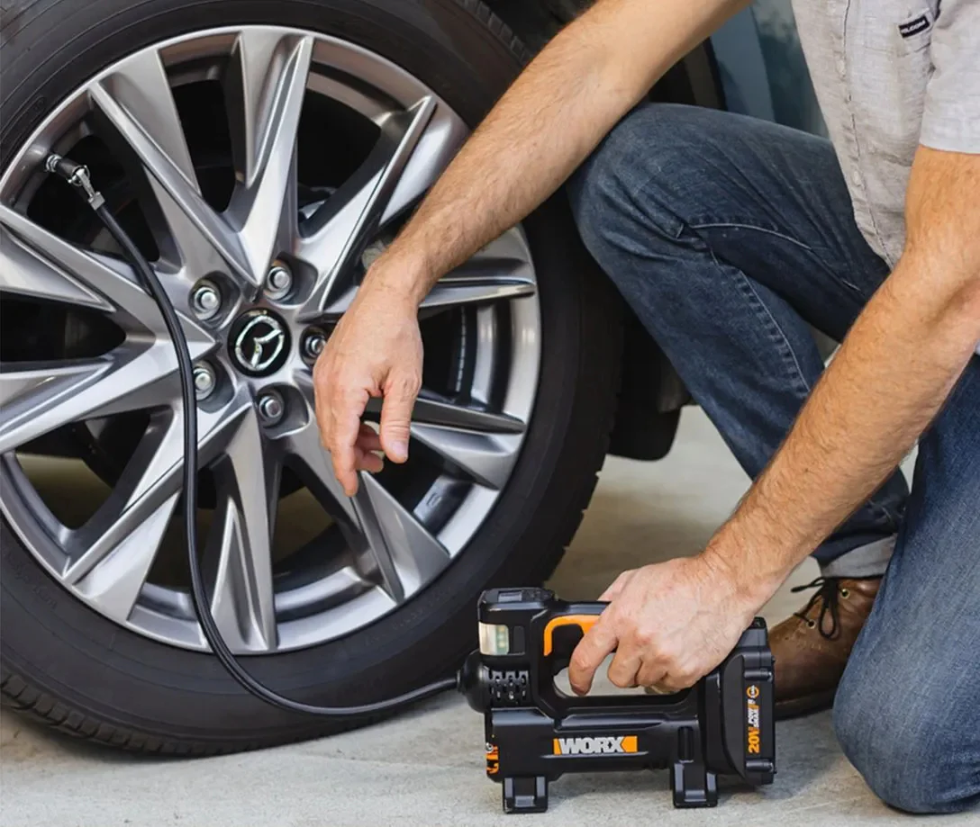 You can inflate all the tires on the car and then some with the Worx 20V Power Share Portable Inflator. It fills up 4.5 tires on one charge. And it goes from 0-36 psi in about 4 minutes per tire. That's faster and more efficient than inflators from other brands. And you don't have to plug it into your car's DC port and then park some place that's convenient to use it. With the powerful 20V battery (that's the same one we use on our leaf blowers and cordless chainsaws. by the way). you just bring the inflator wherever it needs to go. Take it to the pool. the dock. even pack it for a long bike ride. it's the ultimate in portability and convenience. The LED lamp outputs 100-200 Lumens and can be used as a work light so you can see what you're doing. a flashlight if you need to take a walk in the dark to a service station. even an emergency beacon to alert other motorists that you need assistance. The flexible 2.3-foot hose lets you reach nozzles and stems that are hard to get at. and it comes with 3 adaptors: 1 sports ball needle. 1 Presta and bike valve adaptor. 1 tapered adaptor for small inflatables like pool toys. Plus. the soft-grip handle is comfortable to hold and use for long stretches. Keep the Worx 20V Power Share Portable Inflator in your trunk and gain the peace of mind you get from being prepared.