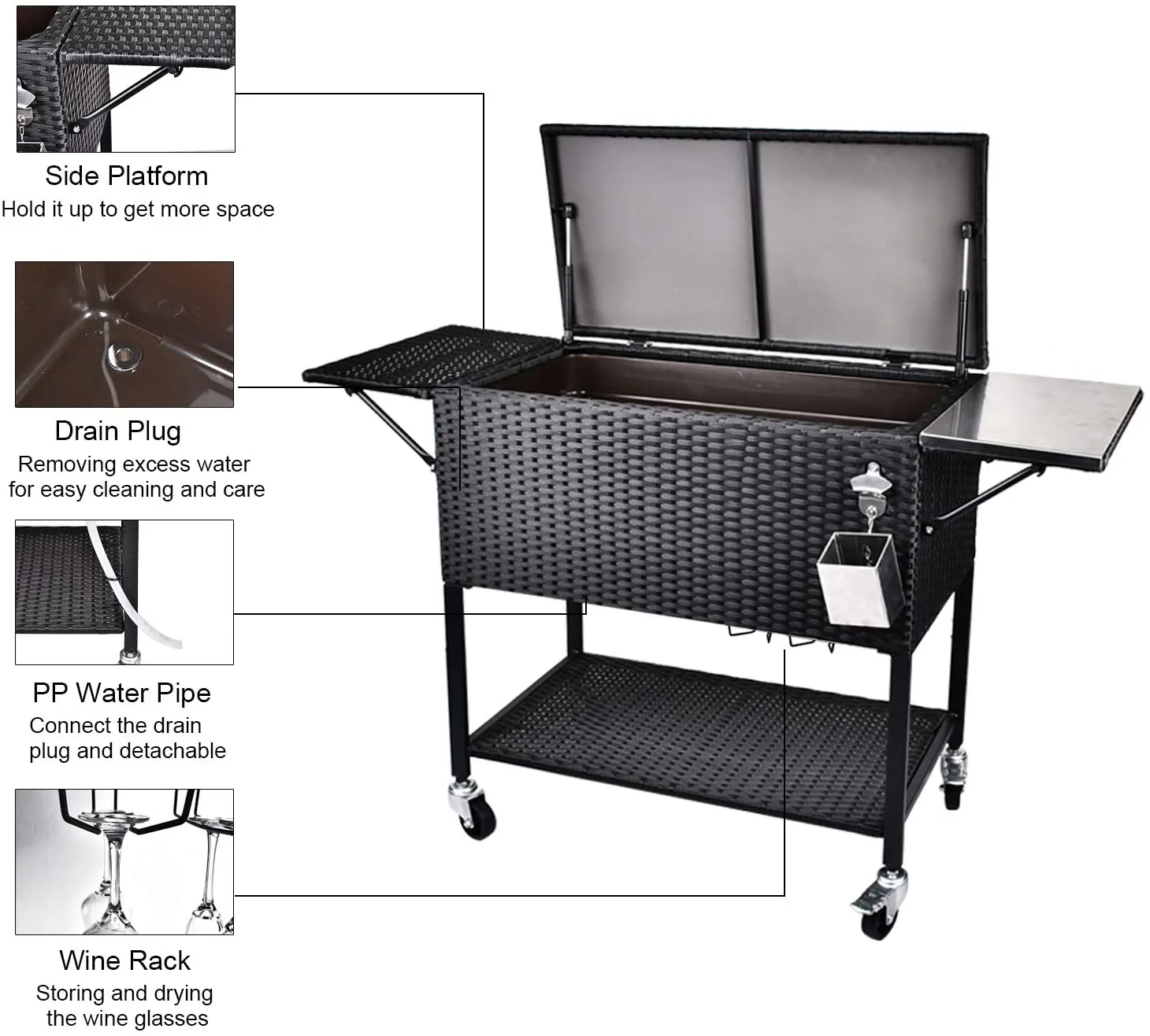 • ��80 Quart Rolling Rattan Cooler�� �� Oversized 80 Quart/ 20 Gallon capacity, holds up to 100 cans / 50 bottles. Wicker rattan perfectly matching with the surroundings. Perfect for patio, backyard or any outdoor leisure occasion, such as dinner party, BBQ or backyard party