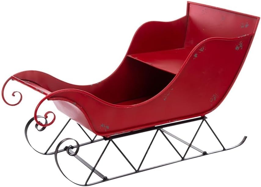 • CHRISTMAS SLEIGH DESIGN: Vintage sleigh brings color and life to your home. Made of stable iron, features an peeling paint‌ distressed design, it will last season after season! Enjoy beautiful Christmas with this large red sleigh container shelf candy basket